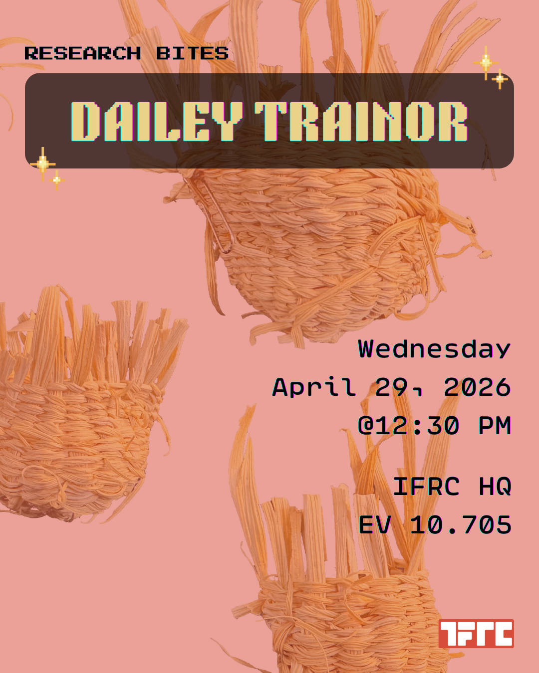 Research Bites is a lunchtime series hosted by the IFRC that creates a space for members to share their work in a casual, conversational setting. Bring your lunch, meet fellow researchers, and join us for inspiring exchanges across disciplines!